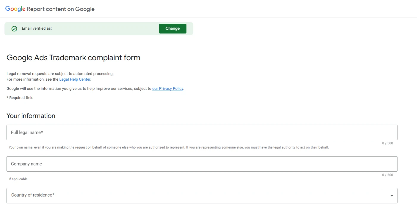 After completing all previous steps, Google finally grants access to the full Google Ads Trademark Complaint Form, where you will be asked to provide: